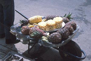Pineapples, tastefully presented in a wheelbarrow.