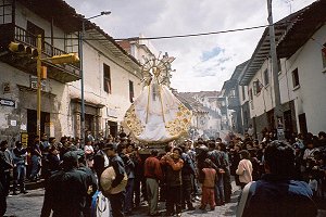 A religious parade wends it's way through the streets of Cusco.