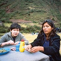 Our guide, Luz-Maria, demostrates to Pat the elegant art of chewing